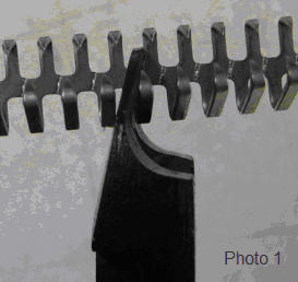 2. Cut the fastener strip to length by cutting through the bar at the measured location. Locate the diagonal score on the inside of the bar that is nearest to the length required. Using your cutters, snip along the diagonal score (See photo 1). In some cases. it may be necessary to grind down the bar after the cut so that there is no overlap in the lacing.